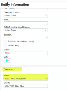 - In the Contacts section, select a contact from the Entity drop down